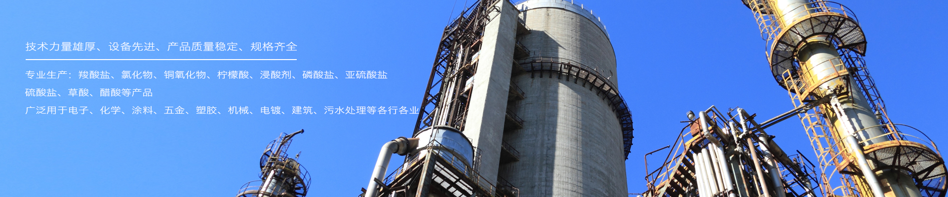 主要產品有:羧酸鹽、氯化物、銅氧化物、檸檬酸、浸酸劑、磷酸鹽、亞硫酸鹽、硫酸鹽、草酸、醋酸等,廣泛用于電子、化學、涂料、五金、塑膠、機械、電鍍、建筑、污水處理等各行各業。